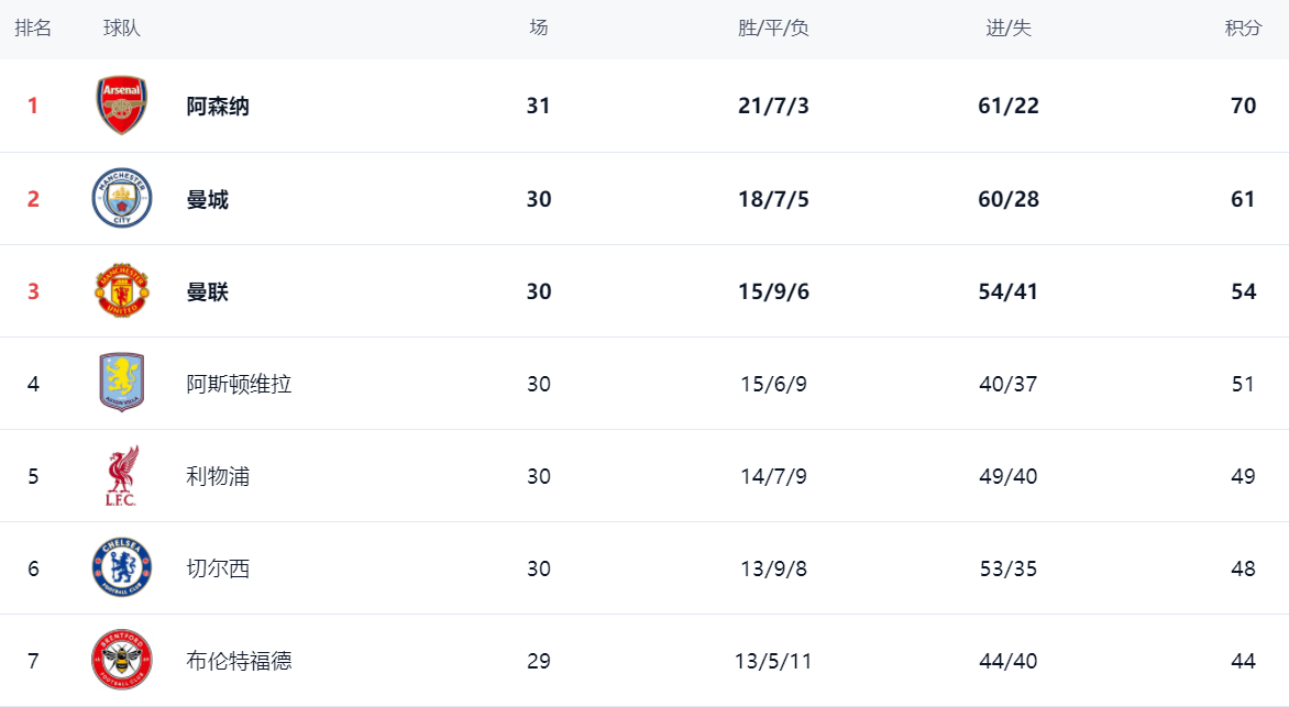 ในอันดับ อาร์เซนอลครองรายชื่อ โดยได้อันดับหนึ่งด้วยคะแนน 70 แต้ม แมนเชสเตอร์ ซิตี้ มักจะดรอปโซ่ และช่องว่างกับอาร์เซนอลก็ใหญ่ขึ้นเรื่อยๆ ตามหลัง 9 แต้ม รั้งอันดับสอง และโดยพื้นฐานแล้วหวังว่าจะไม่มีการแข่งขันเพื่อชิงแชมป์ หลังจากแมนฯ ยูไนเต็ด ชนะ คะแนนรวมถึง 54 แต้ม รวมอันดับสาม แอสตัน วิลล่า ทำได้ 51 แต้ม อยู่ในอันดับที่ 4 ลิเวอร์พูลทำได้เพียง 1 แต้มในรอบนี้ ด้วยคะแนนรวม 49 คะแนน อันดับที่ 5 และพลาดอันดับ 4 เชลซี ได้คะแนน 48 คะแนน ตกไปอยู่อันดับที่ 6