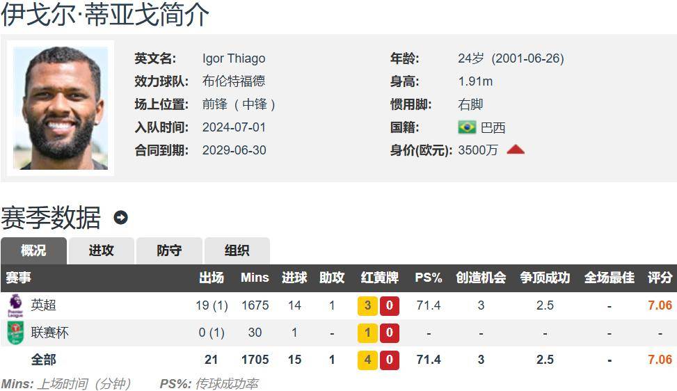 อิกอร์ ติอาโก้ อายุ 24 ปี สูง 1.91 เมตร เป็นกองหน้าตัวเป้าถนัดเท้าขวา นักเตะชาวบราซิลรายนี้อยู่ภายใต้สัญญากับเบรนท์ฟอร์ดจนถึงปี 2029 โดยมีมูลค่าประเมินจาก Transfermarkt อยู่ที่ 35 ล้านยูโร ในฤดูกาลนี้ อิกอร์ ติอาโก้ ลงเล่นในพรีเมียร์ลีกครบทั้ง 20 นัด เป็นตัวจริง 19 นัด และทำไป 14 ประตู