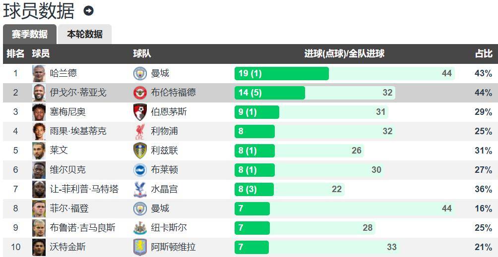 ในตารางคะแนนพรีเมียร์ลีก เออร์ลิง ฮาแลนด์ นำเป็นอันดับหนึ่งด้วย 19 ประตู (รวมถึงลูกโทษ 1 ประตู) ขณะที่ อิกอร์ ติอาโก้ อยู่ในอันดับสองด้วย 14 ประตู (รวมถึงลูกโทษ 5 ประตู) สองนักเตะนี้เป็นเพียงสองคนที่ทำประตูได้ถึงสองหลักในลีกฤดูกาลนี้