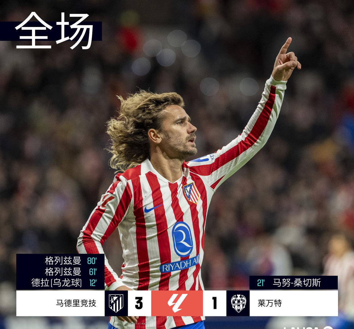 แอตเลติโก มาดริด 3-1 เลบันเต้: กรีซมันน์ทำแฮตทริกจากม้านั่งสำรอง! ขยายสถิติไร้พ่ายเป็น 11 นัด สร้างสถิติที่ดีที่สุดของฤดูกาล ทีมของซิเมโอเน่แสดงให้เห็นถึงจิตวิญญาณการต่อสู้อันเป็นเอกลักษณ์ในการกลับมาชนะ โดยแสดงความแข็งแกร่งผ่านสามช่วงเวลาสำคัญ: