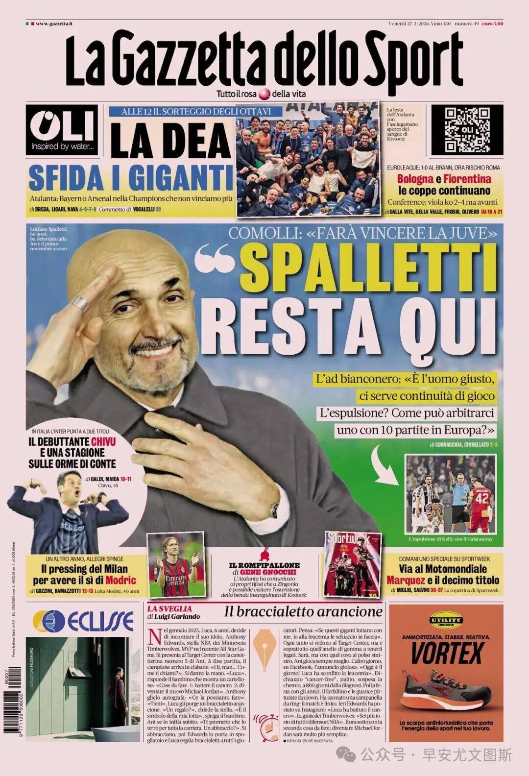 1. "สปัลเล็ตติอยู่ต่อ" โคโมลี่: "เขาจะทำให้ยูเวนตุสชนะ" ซีอีโอบีアンโคเนรี: "เขาคือคนที่เหมาะสมกับงานนี้ เราต้องการความสม่ำเสมอในสไตล์การเล่นของเรา ใบแดง? ผู้ตัดสินที่มีประสบการณ์เพียงสิบนัดในยุโรปจะตัดสินเราได้อย่างไร?"