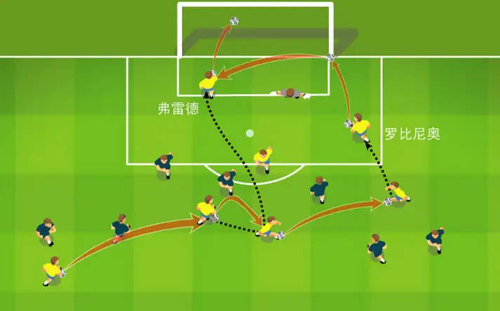 ลูกบอลถูกเล่นกลับไปยังแบ็คขวา หรือไปยังกองกลางหมายเลข 8 เพื่อจัดระเบียบการโจมตีใหม่ ซึ่งต่อมาถูกหยุดลง