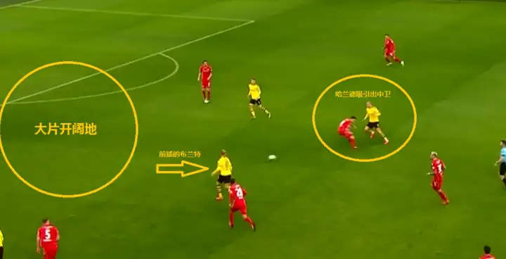 เพื่อความเข้าใจที่ชัดเจนยิ่งขึ้น ผมได้บันทึกและใส่คำอธิบายประกอบในภาพไว้แล้ว โปรดสังเกตการเคลื่อนไหวของฮาแลนด์และบรันด์ทของดอร์ทมุนด์ก่อนหน้านี้ จะเห็นว่าฮาแลนด์ถอยลงไปลึกเพื่อดึงเซ็นเตอร์แบ็คฝั่งตรงข้ามออกจากตำแหน่ง ทำให้บรันด์ทสามารถวิ่งขึ้นหน้าเข้าไปในช่องว่างได้ การเคลื่อนไหวนี้ทำให้การประกบโซนของฝ่ายตรงข้ามสับสนในทันที
