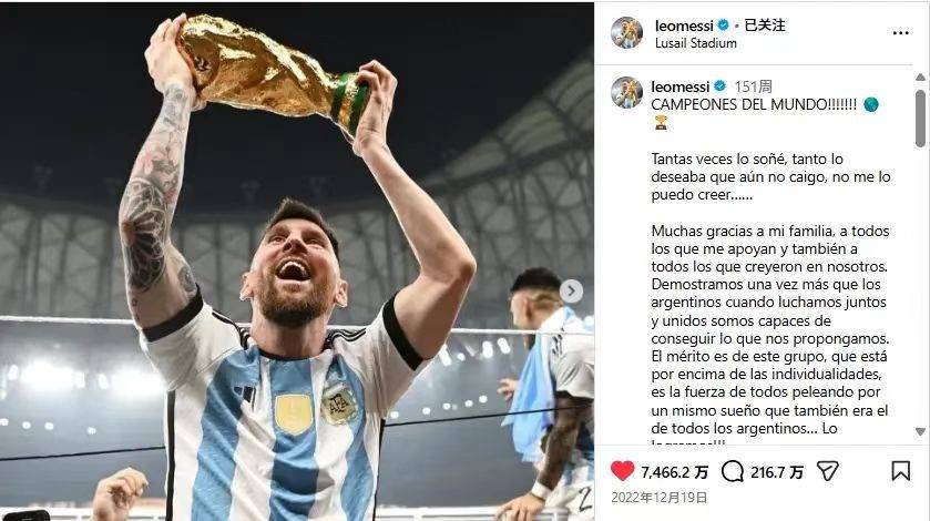 หลังจากคว้าแชมป์ฟุตบอลโลก ลิโอเนล เมสซี ก็สามารถคว้าแชมป์ใหญ่ทั้งในระดับสโมสรและทีมชาติได้สำเร็จ โพสต์เกี่ยวกับฟุตบอลโลกของเขาเพียงอย่างเดียวก็ทำให้สถิติโซเชียลมีเดียพุ่งสูงขึ้นถึงสามครั้งติดต่อกัน จนถึงปัจจุบัน โพสต์ฉลองชัยชนะฟุตบอลโลกของเขาได้รับยอดไลค์ถึง 74.662 ล้านครั้งบนแพลตฟอร์มโซเชียลมีเดียต่างๆ ซึ่งเป็นตัวเลขที่ไม่มีใครสามารถทำลายได้นอกจากนี้ โพสต์ของเขาที่แสดงให้เห็นว่าเขากำลังนอนหลับข้างถ้วยรางวัลหลังจากชัยชนะได้รับยอดไลค์ถึง 53.67 ล้านครั้ง ซึ่งจัดเป็นโพสต์ที่ได้รับยอดไลค์มากที่สุดเป็นอันดับสามในประวัติศาสตร์ของสื่อสังคมออนไลน์ อีกหนึ่งภาพที่มีเขาพร้อมกับถ้วยรางวัล คราวนี้อยู่บนเครื่องบิน ได้รับยอดไลค์ 41.13 ล้านครั้ง ซึ่งปัจจุบันอยู่ในอันดับที่ห้าในตารางการจัดอันดับยอดไลค์ตลอดกาล