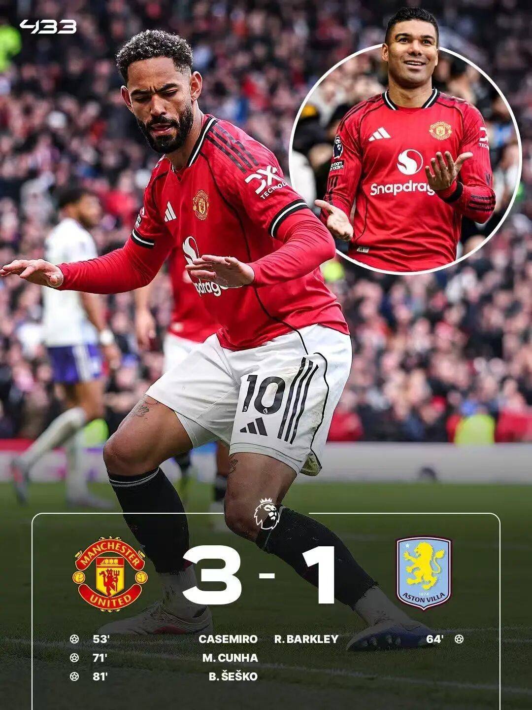 แมนฯ ยูไนเต็ด เอาชนะ เวร่า 3-1 ในบ้าน ในแคมเปญนี้ บี ฟี ทำแต้มในนาทีที่ 53 และนาทีที่ 71 ของเกมเพื่อช่วยเหลือเคเซมิโร่และคูเนีย